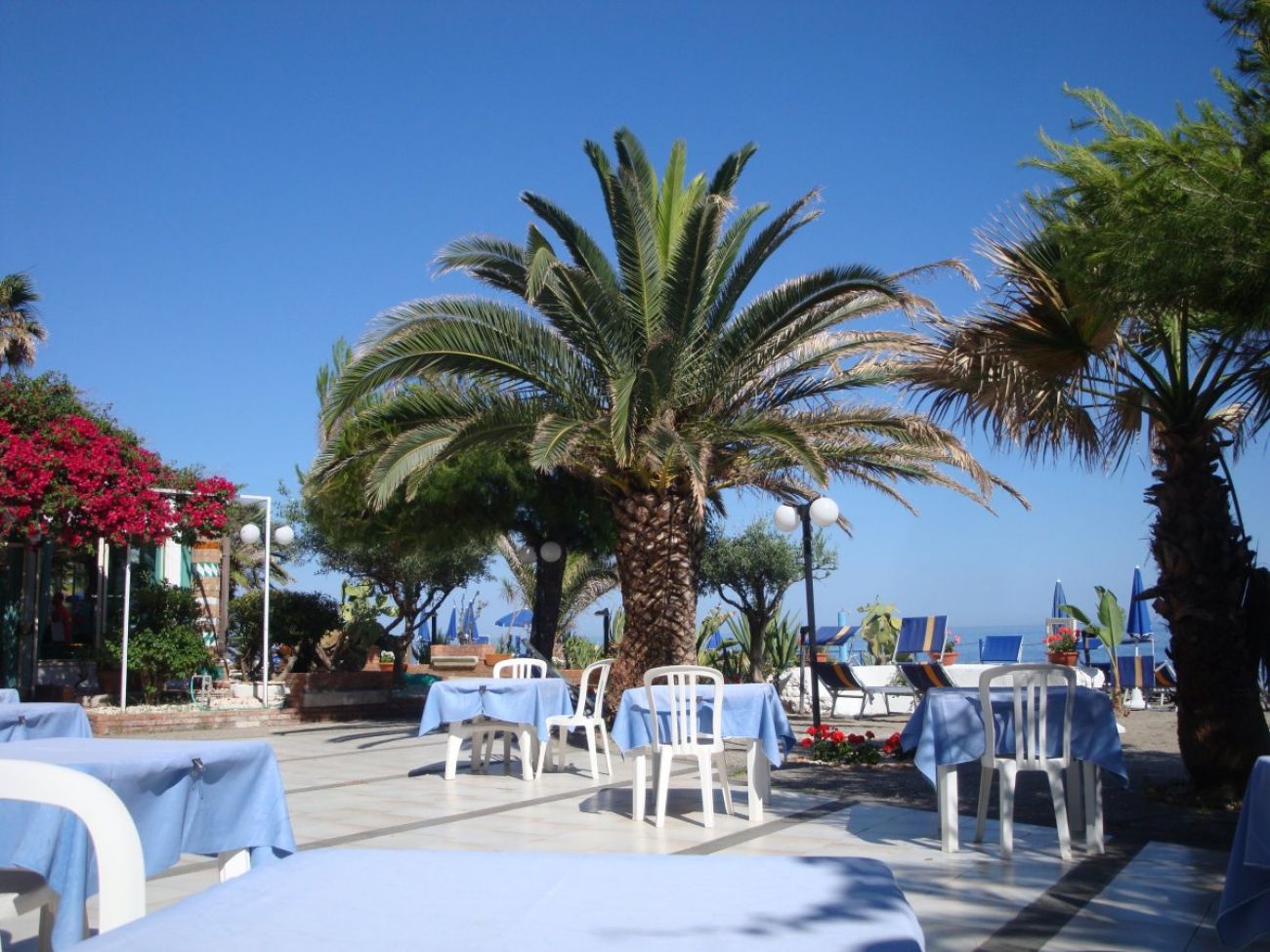 - чадъри и шезлонги на слънчевата тераса пред хотела с директен достъп до морето;