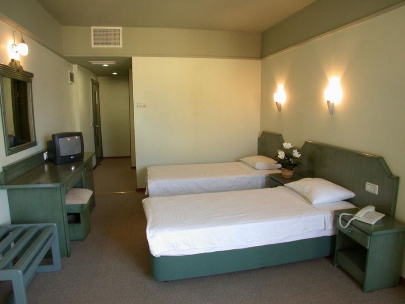 Хотелът разполага общо с 208 стаи с площ, разположени общо в 3 блока. Всички стаи са оборудвани с климатик, телевизор, телефон, баня с душ, сешоар, балкон. Почистване на стаите – всеки ден, смяна на спалното бельо и кърпите – 3 пъти в седмицата.