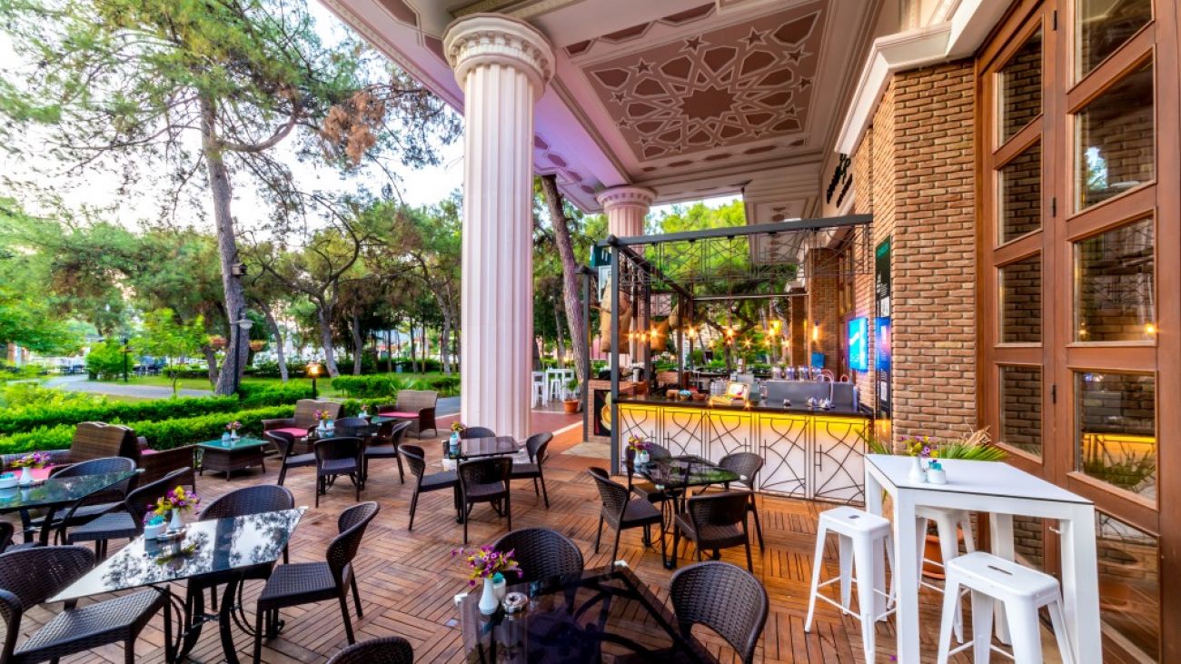 Основен ресторант, 5 а-ла-карт ресторанта (стек хаус, италиански ресторант, китайски ресторант, японски, рибен - срещу заплащане, кебап хаус - безплатен), 5 бара, 3 открити и 1 закрит басейн, магазини, СПА център, конферентни зали, паркинг. За децата: Детски басейн с водни пързалки, детска площадка, мини клуб (4-12 г.), мини амфитеатър, лунапарк. Безплатни услуги: Сауна, турска баня, парна баня, фитнес, плажен волейбол, аеробика, тенис на маса, тенис на корт, дартс, анимация, музика на живо. Платени услуги: Масаж, билярд, игрални автомати, оборудване на тенис корт, осветление за тенис корт, уроци по тенис, моторни водни спортове. Плаж: Собствен, пясъчен, 2 платформи – чадъри и шезлонги на плажа и при басейна – безплатно, плажни кърпи – срещу депозит.