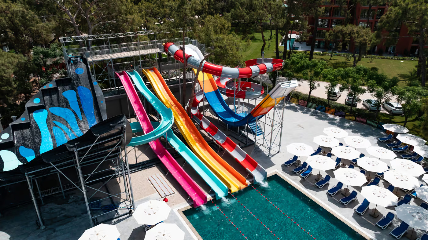 Основен ресторант, 3 а- ла- карт ресторанта/италиански, турски и рибен/, 4 бара, дискотека, открит и закрит басейн, СПА център, хамам, сауна, фитнес, масажи, 3 водни пързалки, магазини, паркинг. За децата: Детско меню, детски басейн, водни пързалки, детска площадка, мини дискотека, бебешко креватче, бебешки столчета, бебефон и други бебешки приспособления/със предварителна заявка - безплатно/. Безплатни услуги: Сауна, турска баня, фитнес, аеробика, тенис корт, наем на ракети и топки за тенис, волейбол, кино, немоторни водни спортове, кану, водно колело, анимация, интернет. Платени услуги: СПА център, масажи, фризьор, магазини, билярд, боулинг, моторни водни спортове.