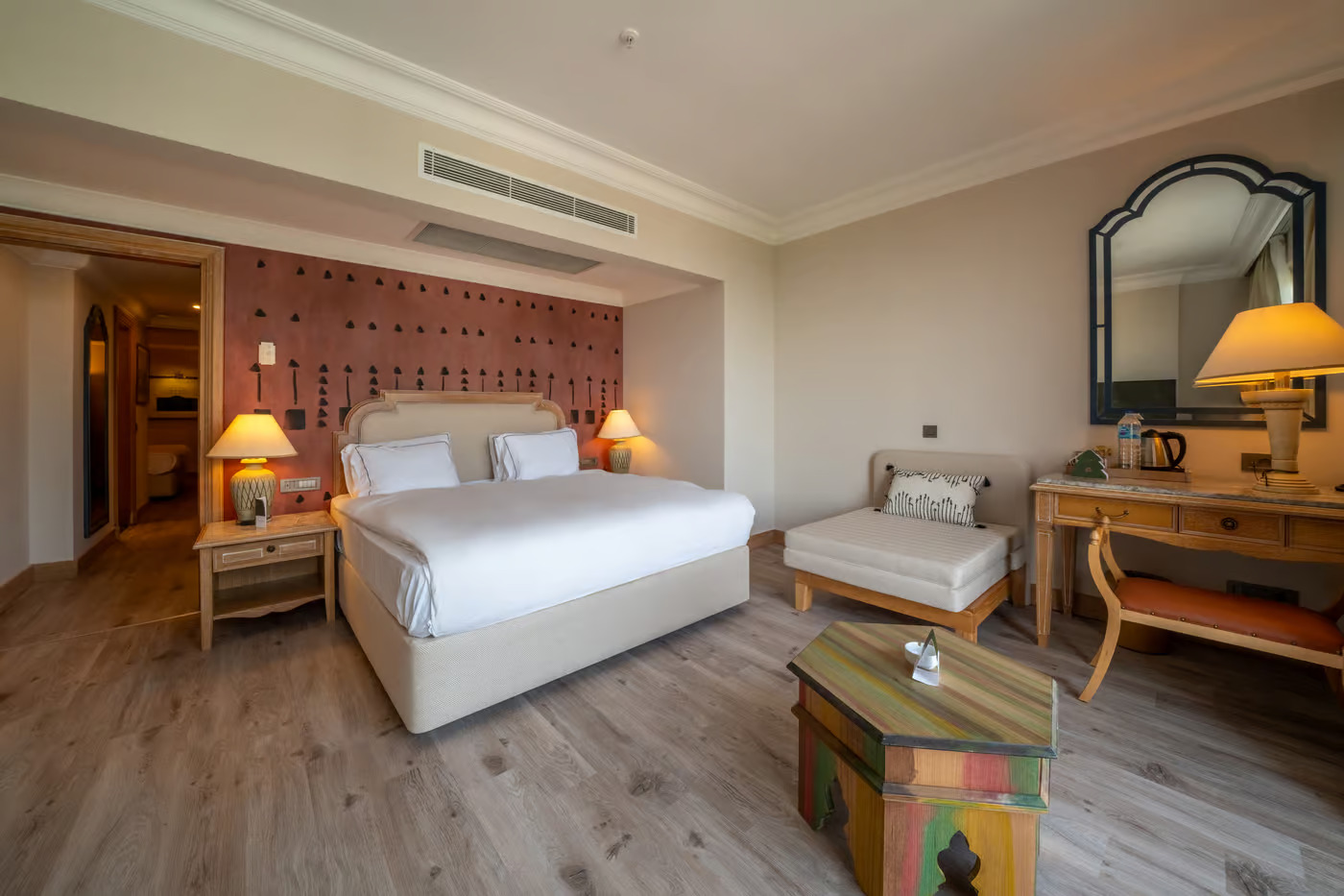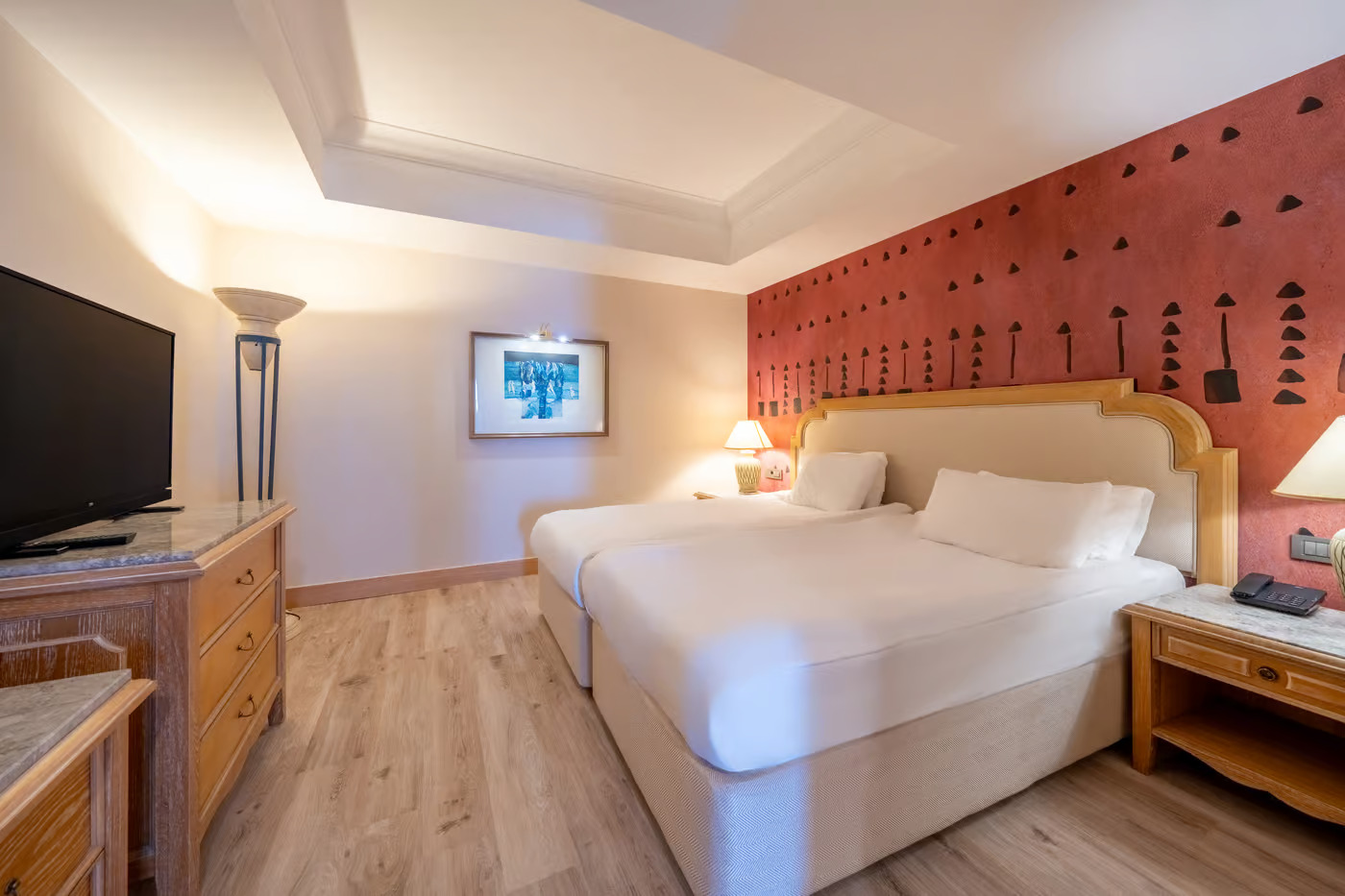 Хотелът разполага с 349 стаи, всяка една е оборудвана с климатик, сателитна телевизия, телефон, баня с душ, сешоар, мини бар/безплатно/, сет за кафе и чай, сейф, балкон, интернет. Почистване на стаите- всеки ден, смяна на бельото и кърпите- 3 пъти в седмицата.