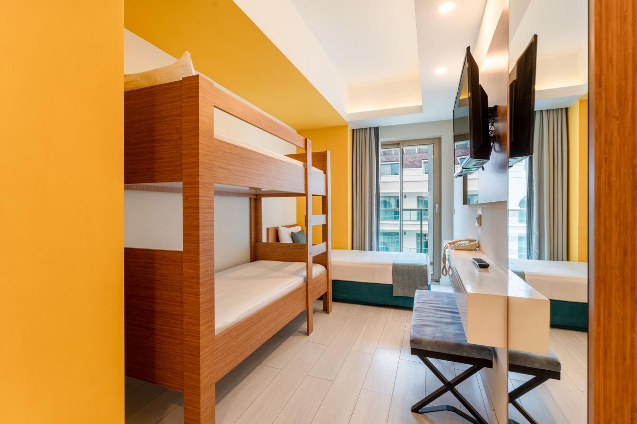 60 Garden Block Standard Room (изглед градина - 26 м2), 275 Standard Room (изглед градина, планина или страничен изглед море - 22 м2), 50 Standard Bunkbed Room (1 спалня и 2-етажно легло, изглед градина или планина - 26 м2), 3 Disabled Rooms (стаи за инвалиди, на първи етаж в основната сграда, гледка градина или планина - 22 м2), 32 Family Room (2 стаи със свързваща врата, 1 спалня и двуетажно легло, гледка градина - 33 м2), 10 Love Suit (спалня, тераса с джакузи, изглед басейн или частично море - 22 м2), 16 Swim -Up Room (спалня, тераса с директен достъп до общ басейн - 26 м2).