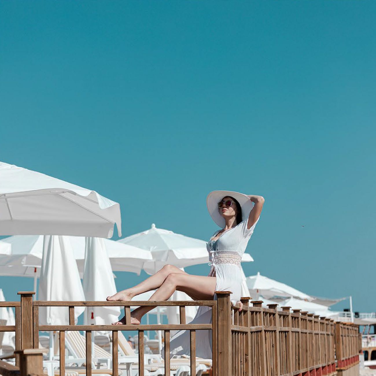 Собствен, пясъчен с дължина 120 м, удостоен със сертификат "Син флаг" и платформа (2040 м²). Шезлонги, чадъри, матраци и плажни кърпи на плажа и при басейна - безплатно.
