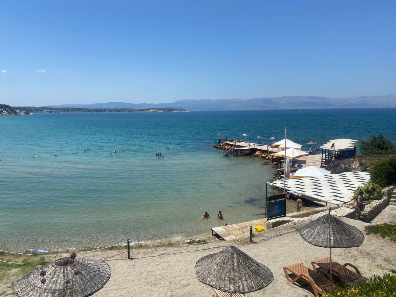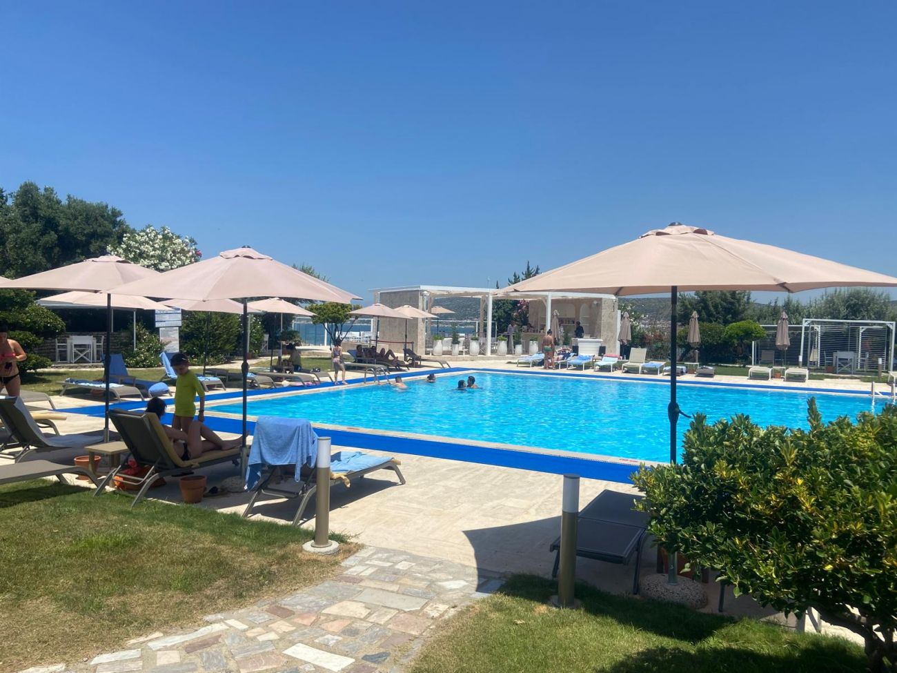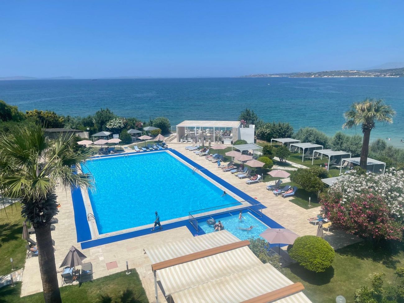 Плаж: дължина на плажната ивица 150 м. Разпределен на 3 нива – първите две нива са с фин пясък, а третото ниво е тревна площ . Морското дъно е с фин пясък плавно полегато. Плажът е удостоен със сертификат „Син флаг“. Има и платформа. Чадъри, шезлонги и матраци на плажа и при басейна- безплатно. Плажни кърпи - безплатно.