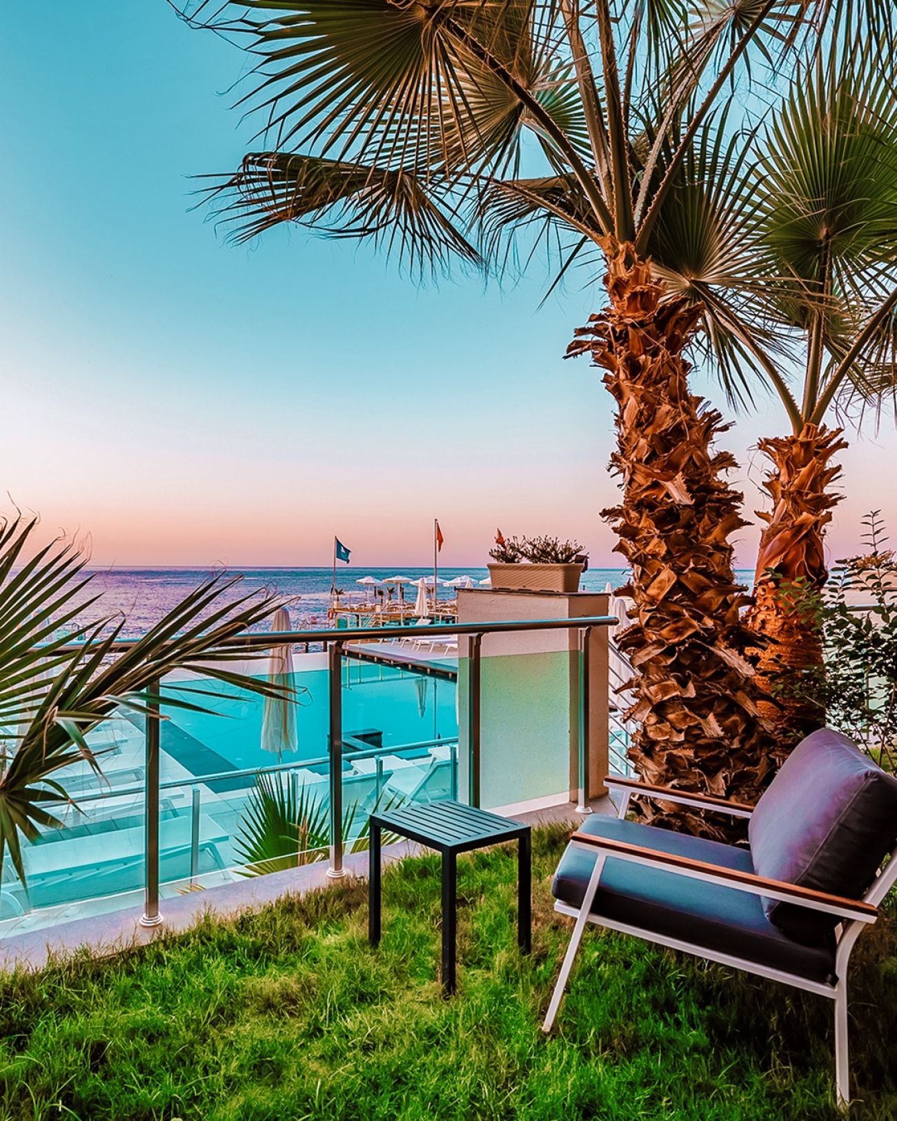 Собствен, платформа и пясъчна зона. Чадъри и шезлонги на плажа и при басейна безплатно.