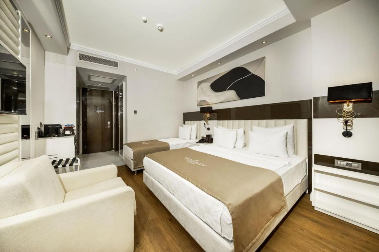 От които 5 Promo room (без балкон – 22 м2), 30 Deluxe sea view (изглед море 26 - 30 м2), 160 Deluxe room, 16 Garden room with Terrace - с тераси, 20 Junior Suite Room (хол + спалня 32 – 34 м2).