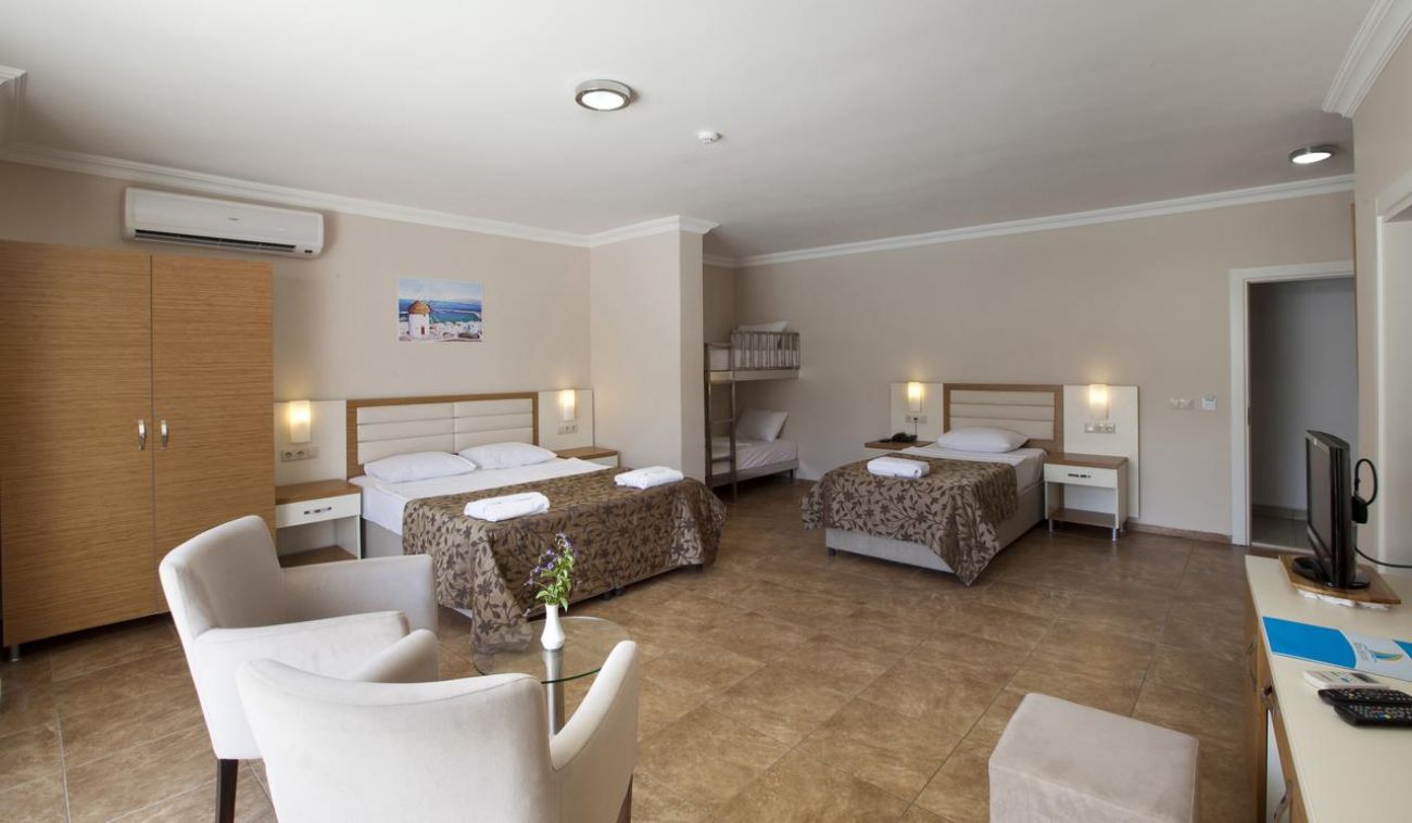 Хотелът разполага с общо 90 стаи, разположени в 3-етажна сгради, от които 70 Standard room (17 м²), 20 Large Room (35 м², спалня и двуетажно легло). Всички стаи са оборудвани с климатик, телевизор, телефон, баня с душ, сешоар, сет за чай/кафе, минибар (наличен само в деня на настаняване; безплатен за гости на All Inclusive), сейф (безплатен).